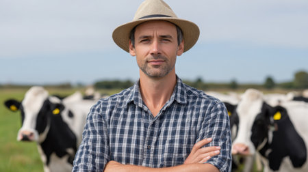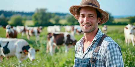 Smiling farmer in overalls and straw hat, standing in a green field with cows