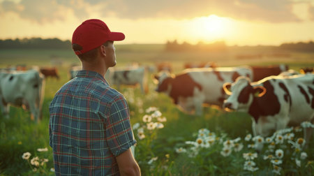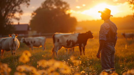 Sunset Serenity at the Farm: A Farmer Gazing over the Pasture with Cattle in the Warm Light.