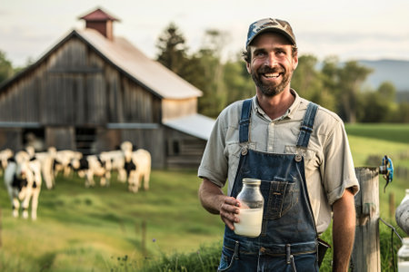 A smiling farmer, wearing overalls, offers jars of farm-fresh milk and yogurt with his rustic barn and cows in the background.