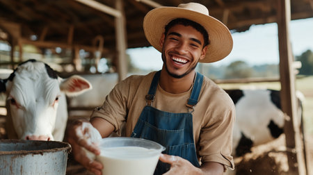 Young farmer smiles while milking cows on a sunny day at a rural dairy farm in the countryside