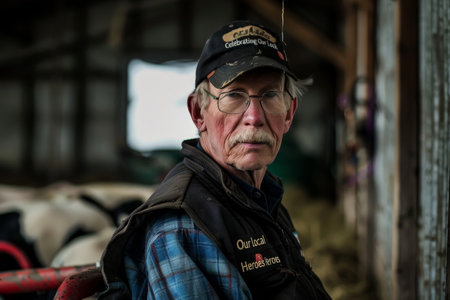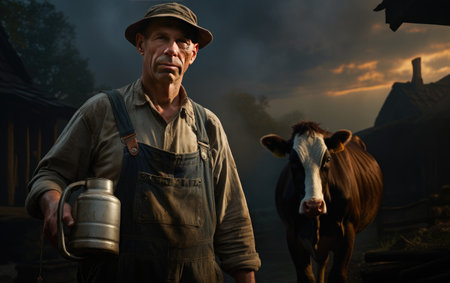 A portrait of a seasoned dairy farmer, standing proud in his barn, with a gaze that tells a story of dedication and resilience in rural life.