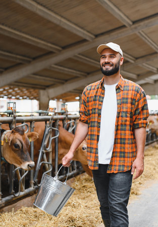 Young farmer carrying metal bucket walking near jersey cattle in barn, agriculture and farming industry