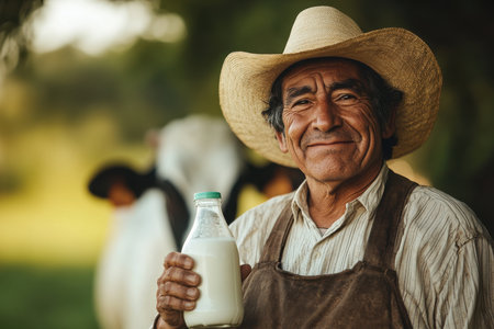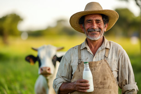 Happy farmer showcasing fresh milk with cow in the green pasture