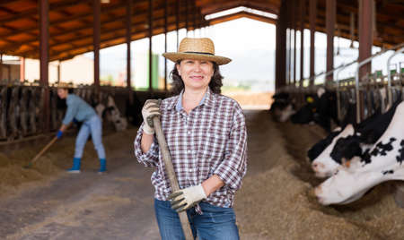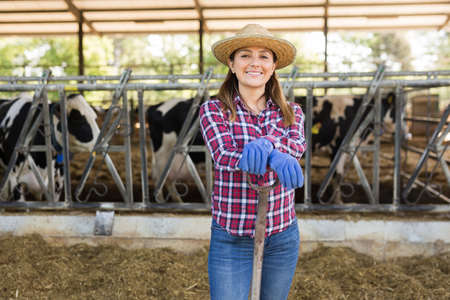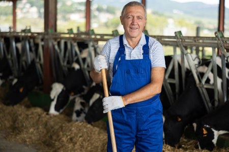 Young farmer standing with crossed arms holding a shovel and watching his cows eating in a stable