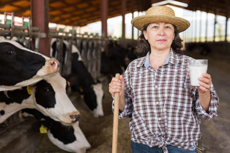 Portrait of an elderly farmer woman standing in a cowshed with a glass of milk