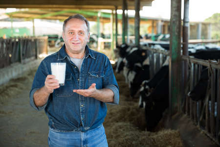 A mature male farmer in a countryside farm with organically grown cows used in biological milk products industry smiles proudly in camera.