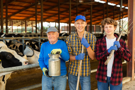 Successful elderly dairy farm owner with son and teen grandson standing in stall with cows