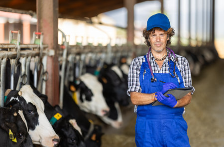 man veterinarian with a tablet in his hands checks the cows in the stall