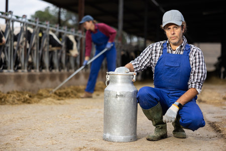 An organic farmer is holding a big milk container pot while working on the farm. The model is a real farm worker!