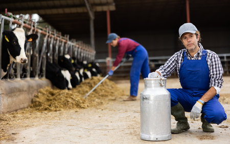Teenage farm worker walking in cowshed with pitchforks and milk can