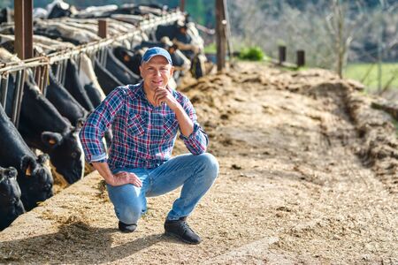 If my cattle are happy, Im happy. a mature man working on a cow farm.