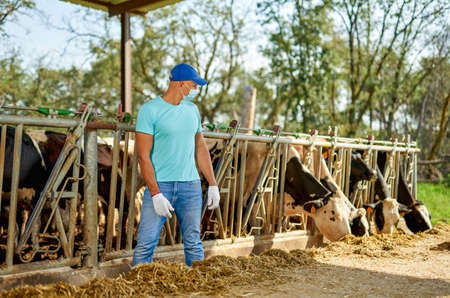 Male farmer wearing an antivirus mask has problems at farm with dairy cows