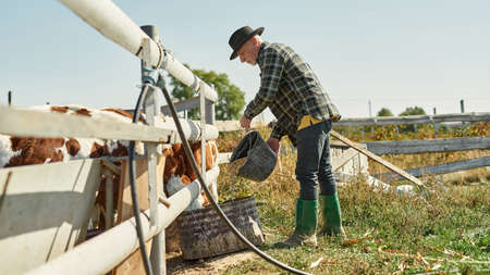 Farmer feeding cows in the barn. Animal husbandry concept.