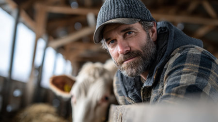 A farmer with a beard wearing a checkered shirt and a beanie is leaning against a wooden railing in a barn. Cows are in the background, creating a serene rural atmosphere.