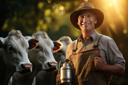 farmer against the background of a herd of cows with cans of milk. generative AI