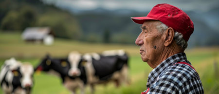 In the countryside, a senior farmer is proudly watching his black and white cows.