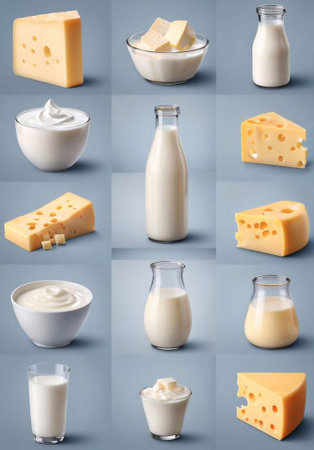A dark background with a variety of dairy products and snacks arranged in a visually appealing manner