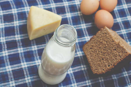 Bottle of milk, cheese and rye brown bread on rustic gingham table cloth