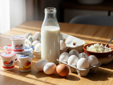 milk, several types of cheese, cottage cheese and eggs stand on a rustic farm table. Generative AI