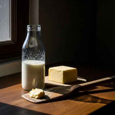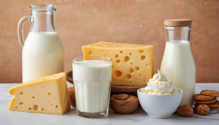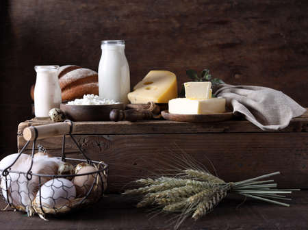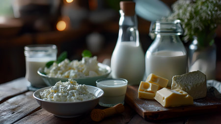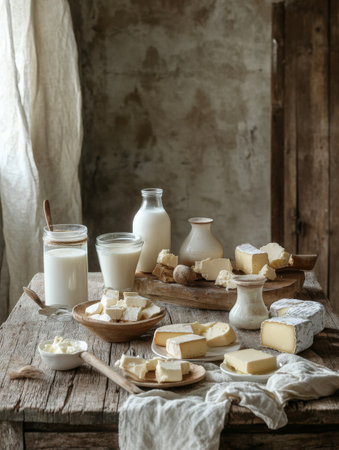 The wooden table features an assortment of dairy items like milk, cheese, butter, and bread, creating a warm, inviting atmosphere.
