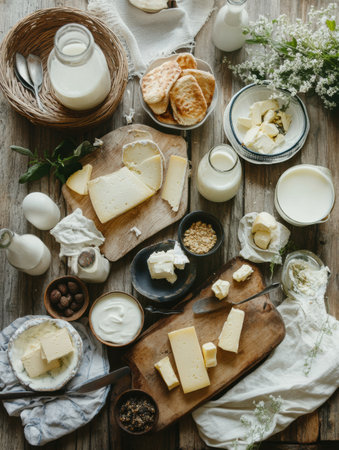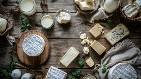 The rustic wooden table is adorned with various dairy products, including creamy cheeses, milk, and rich butter, creating a warm atmosphere.