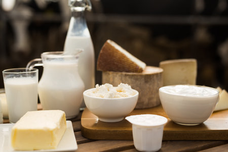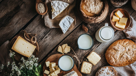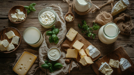 A charming wooden table showcases an assortment of dairy delights, including fresh milk, creamy cheeses, and rich butter perfect for meals.