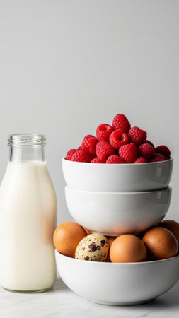 A vertical, tall composition capturing the essential raw ingredients for a raspberry souffle. The sc