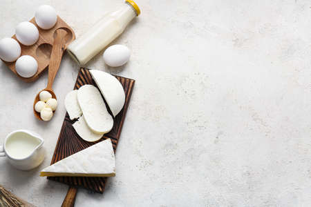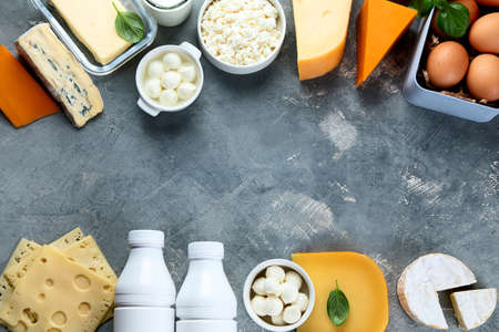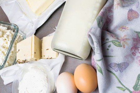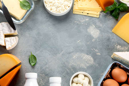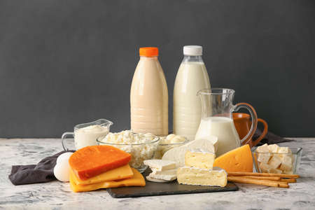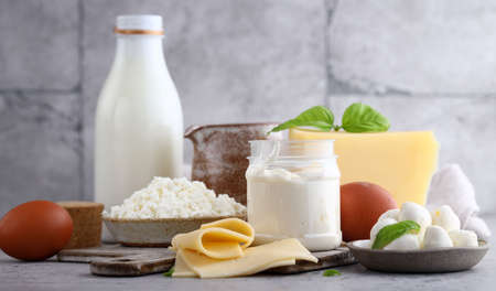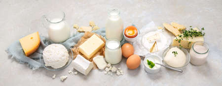 Dairy products on marble table over concrete background. Cheese, farmers cheese, milk, yogurt, sour cream, eggs and smoked cheese. Organic farmers dairy products
