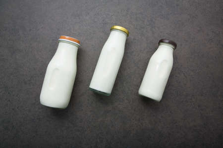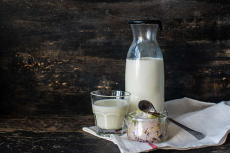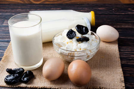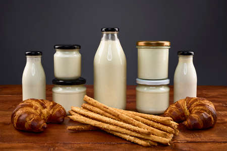 Fresh dairy products on a rustic wooden table. Selective focus.