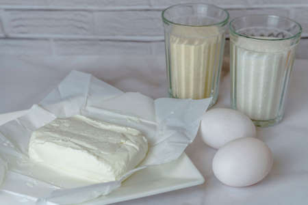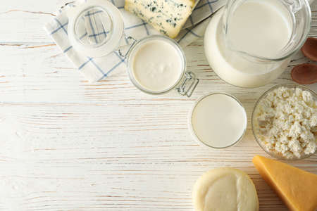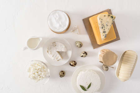 Fermented dairy products such as kefir and cheese on a white background. Copy space