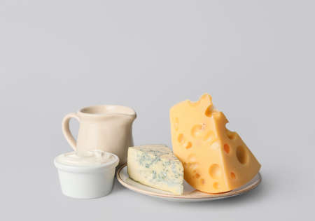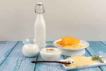 a collection of milk and yogurt cheese, light gray and blue wood background