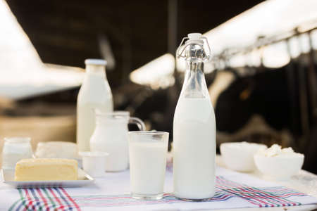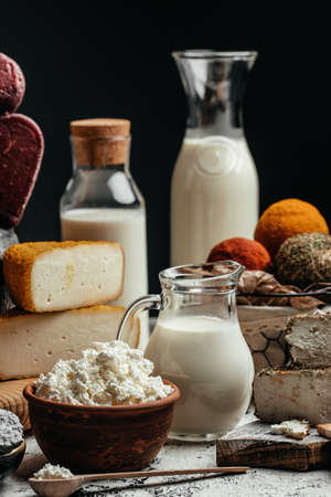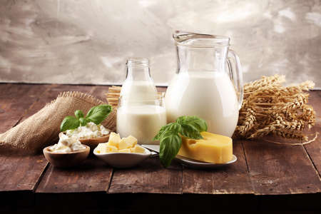 milk products. tasty healthy dairy products on a table and milk jar, glass bottle and cheese