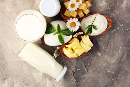 Assortment of fresh dairy products, healthy breakfast with ingredients, natural nutrition concept, maintaining healthy intestinal microflora, top view, rustic table,