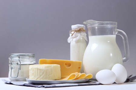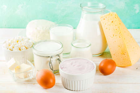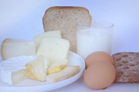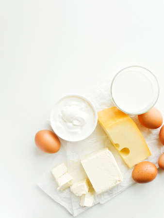 Dairy products, Milk, Sour Cream, Assorted Cheese, Cottage Cheese, Butter and Eggs on white background