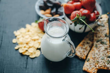 Healthy breakfast: milk, corn flakes, strawberries, cherries, dates, almonds, breads, top view
