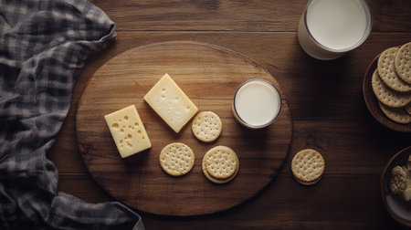 A delicious arrangement of cheese, crackers, and milk on a wooden board, perfect for a casual snack or light meal, showcasing simple indulgence.