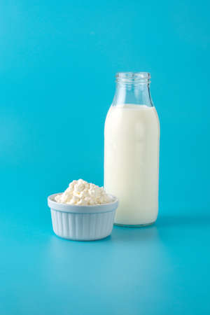 Fresh dairy products. Milk, cottage, cheese, yougurt on blue wooden table top view mock up