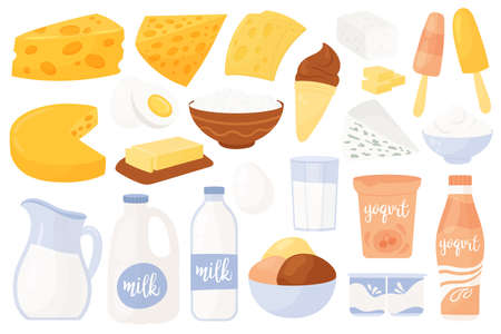 Dairy farm food product set vector illustration. Cartoon collection with glass jar and milk bottle, feta and cottage cheese in bowl, butter and yogurt packages, ice cream cone isolated on white