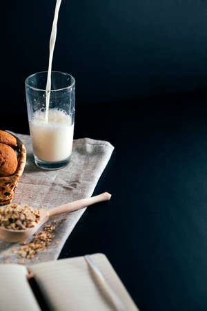 Basket of fresh oatmeal cookies with raw oat flakes in large wooden spoon on napkin on black background. Unrecognizable person pouring milk into glass
