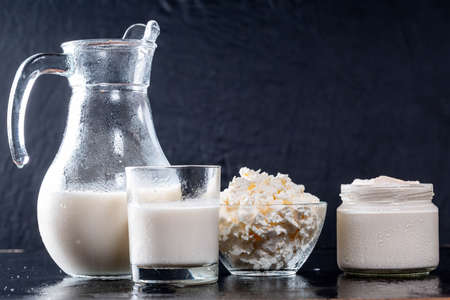 Cheese, butter, yogurt or sour cream, cottage cheese. Farm dairy products concept. Selection of dairy products on rustic wood background. Variety of dairy products on dark background.