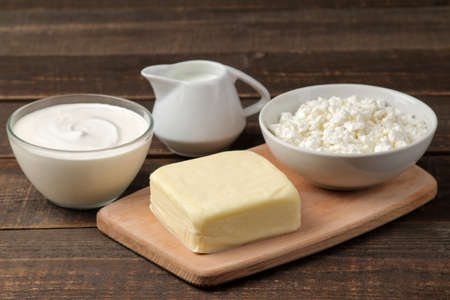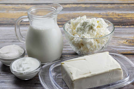 Fresh dairy products, milk, cottage cheese, yogurt, sour cream and butter on a wooden background.