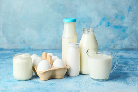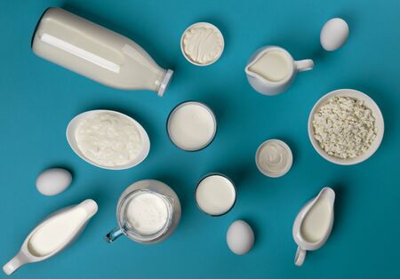 Collection of dairy products on blue background, set of milk, cottage cheese, sour cream and yogurt, top view