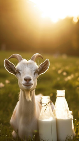 Goat in a pink sweater smiling with a jar of milk surrounded by flowers