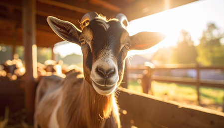 A friendly goat looks directly into the camera from its stall in a rustic wooden barn. The warm, golden light of the rising or setting sun streams in from behind, creating a peaceful and charming atmosphere of farm life.