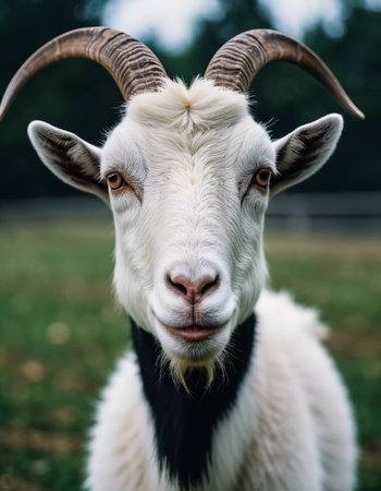 Head of a white goat in the pasture. Animal nose close up, selective focus