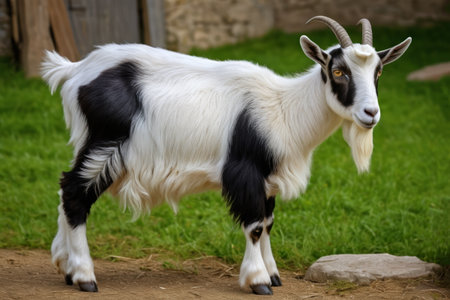 a black-and-white wool goat grazes on a pasture, the concept of agriculture.goats milk