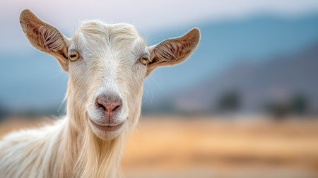 Discover a captivating close-up image of a goat showcasing its striking blue eyes, evoking curiosity and charm against a softly blurred natural background.