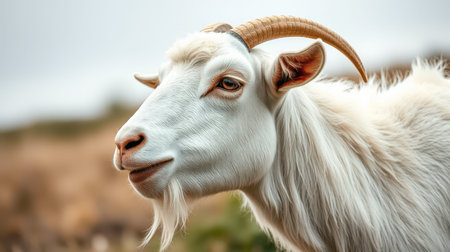 White goat with curved horns calmly grazing in a lush green field during an overcast day in the countryside