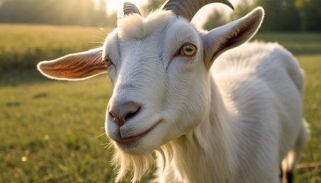 A close-up of a friendly brown goat looking into the camera with a curious and gentle expression. The warm, golden light of the setting sun bathes the farm scene, creating a peaceful and idyllic atmosphere. This image captures the simple charm of rural life and animal connection.