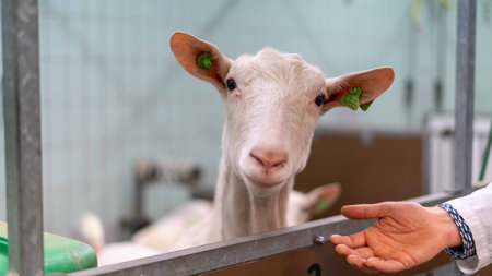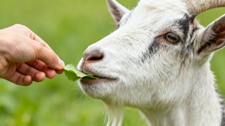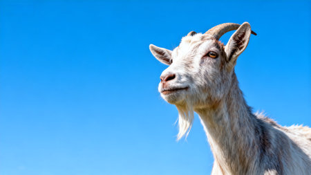 Well-groomed goat on green meadow on a sunny day. Organic dairy products concept. Agricultural landscape. Generative AI.